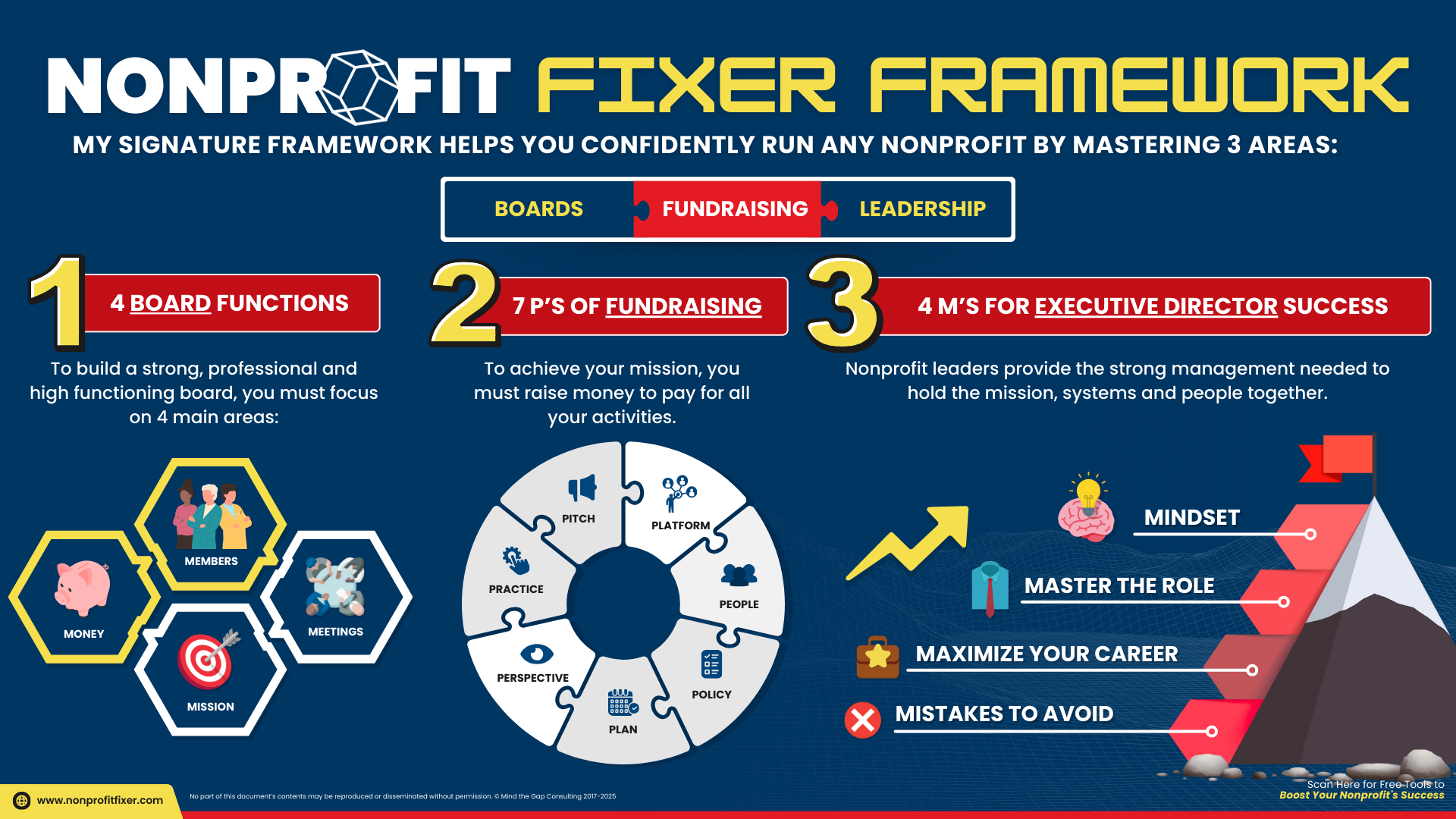 My Nonprofit Fixer Framework helps you and your organization tackle all three areas with powerful interventions, tools, coaching, support, courses, curriculum, and 24/7 support. The Framework boils board service down to 4 Ms (Members, Meetings, Money, Mission).